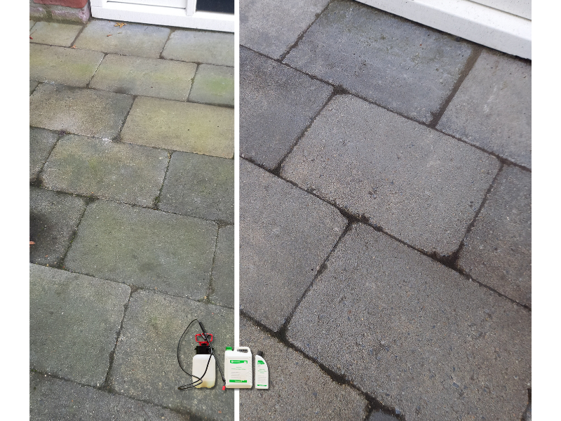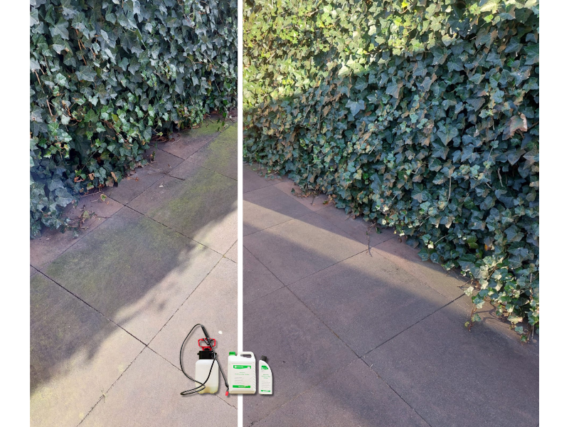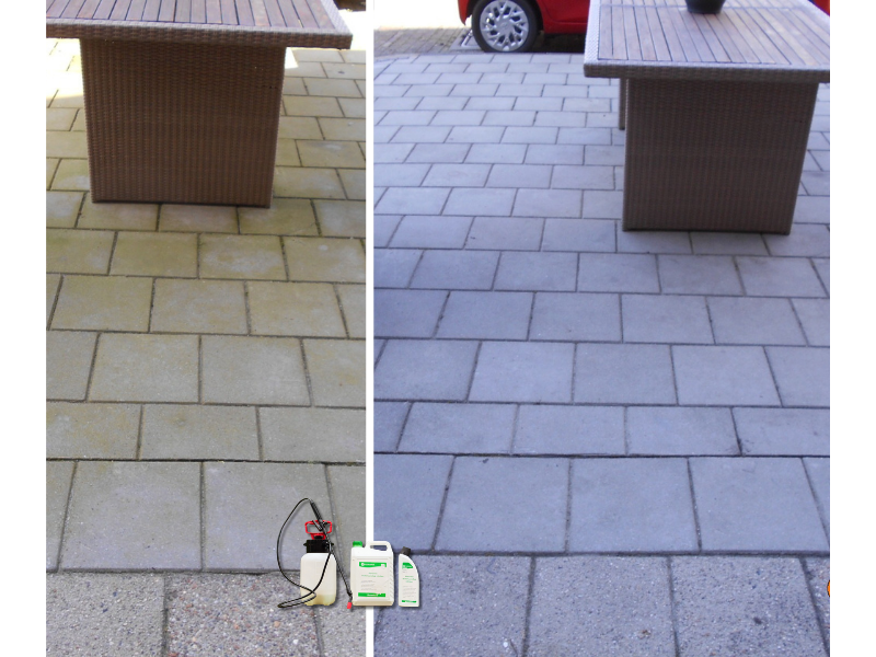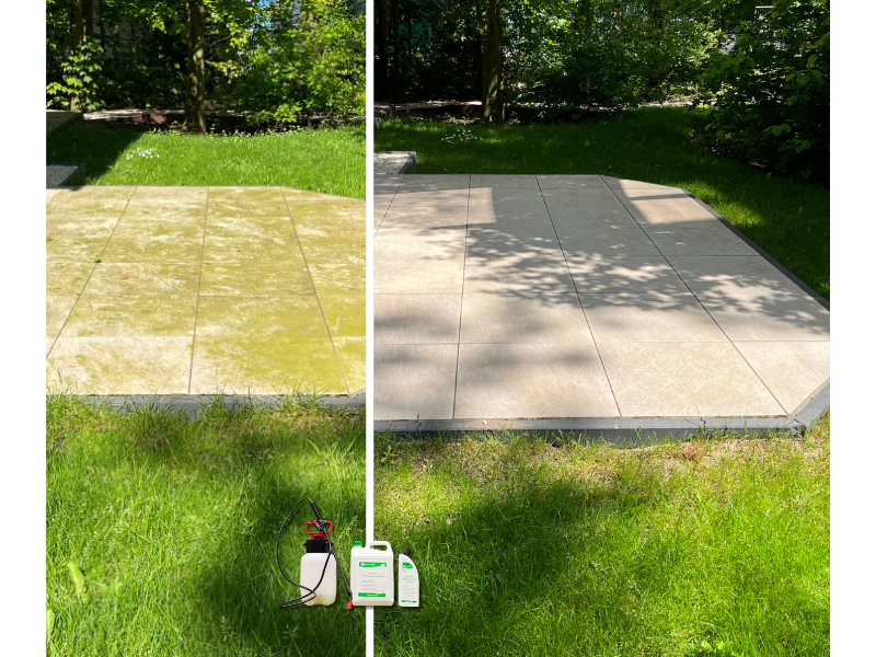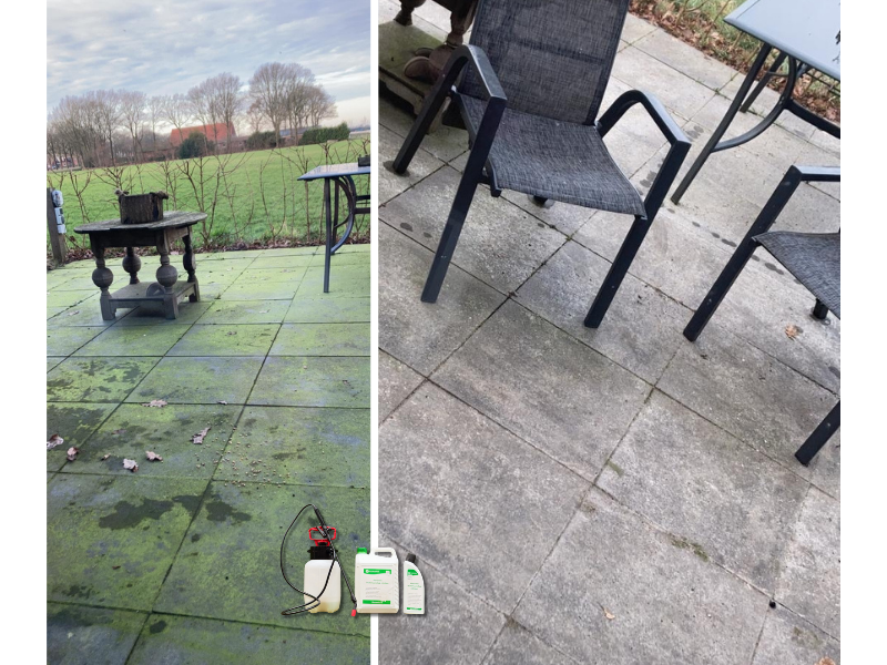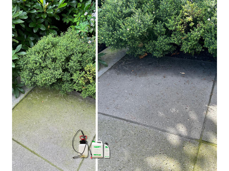 Algen en organisch vuil worden eveneens aangepakt. Sproeien, wachten, klaar. Geen schrobben nodig. De natuur doet het werk.